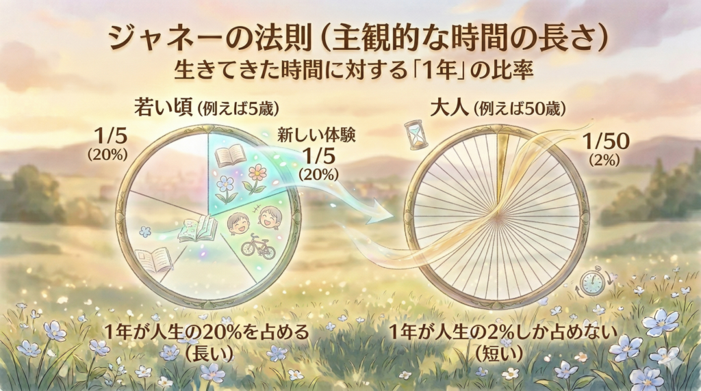 心理学の世界には、時間の感じ方に関する残酷な法則があります。それが「ジャネーの法則」です。